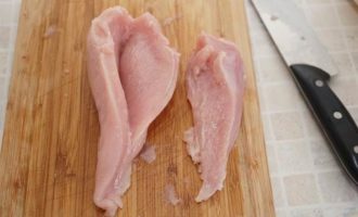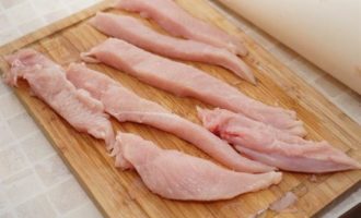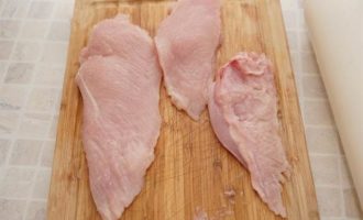 • Филе помыть (у меня 2 штучки), обсушить бумажным полотенцем. Каждое филе разделить на 3 части — как на фото, чтобы каждый кусок был более-менее плоским.