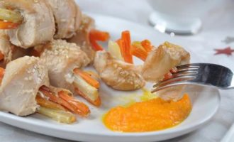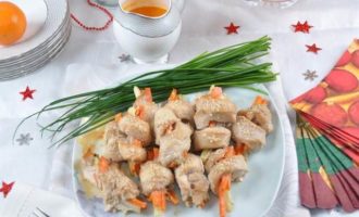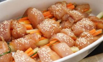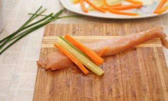 Собираем завитушки: берём 3-4 брусочка моркови, 1 палочку сельдерея и обматываем полоской мяса.
