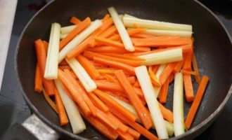 • Стебли сельдерея помыть, нарезать на кусочки такой же длины, как и морковь. И разрезать каждый вдоль на 3 части. Потушить сельдерей с морковью до полуготовности моркови, если надо добавить 1 ст. ложку воды или бульона, присыпать любимыми специями. Я не захотела добавлять никаких специй — хотелось ощутить только вкус овощей. Посолить, поперчить по вкусу.
