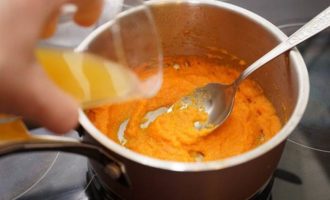 • Готовую морковь взбить в блендере. Для недиетического варианта можно постепенно добавлять сливки. А мы же вернем морковное пюре в сотейник, прогреем немного на огне и добавим процеженный сок половины апельсина. Густоту и остроту соуса регулируйте по Вашему вкусу путем добавления сока и соли-перца. Хорошо перемешать и выложить в соусник.