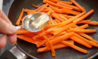 На разогретую с 1 ст.л растительного масла сковороду выкладываем морковь, немного обжариваем со всех сторон, добавляем 1 ст. ложку яблочного уксуса, выпариваем его.