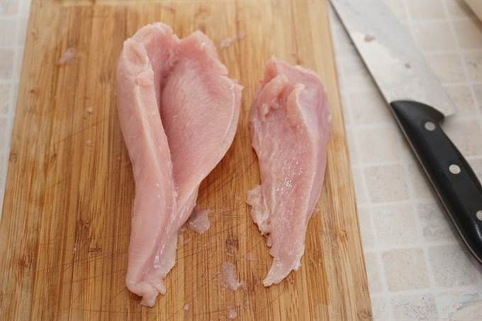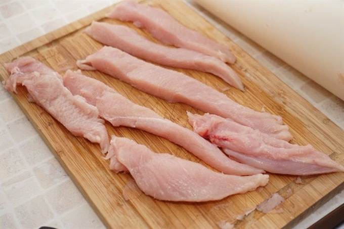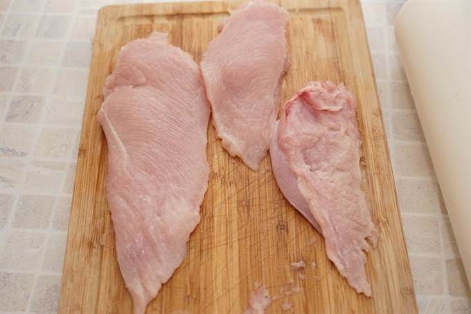 • Филе помыть (у меня 2 штучки), обсушить бумажным полотенцем. Каждое филе разделить на 3 части — как на фото, чтобы каждый кусок был более-менее плоским.