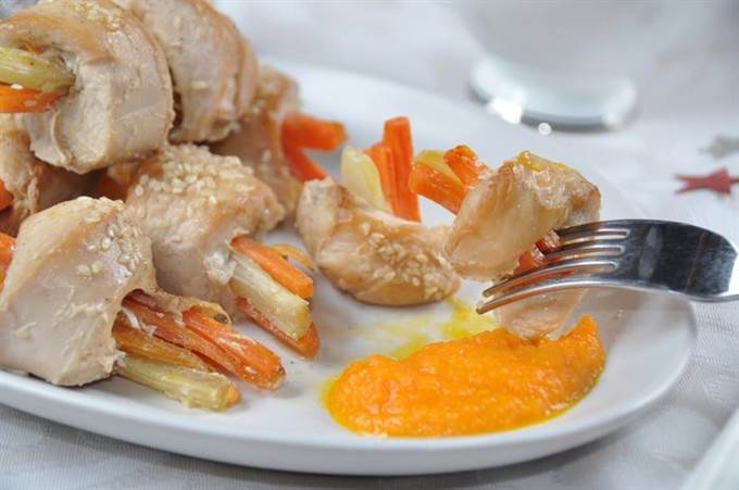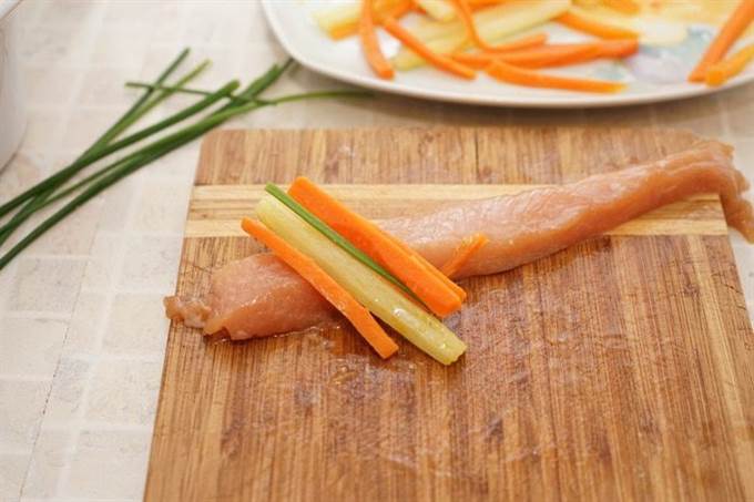 Собираем завитушки: берём 3-4 брусочка моркови, 1 палочку сельдерея и обматываем полоской мяса.
