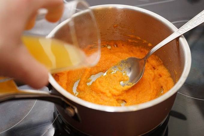 • Готовую морковь взбить в блендере. Для недиетического варианта можно постепенно добавлять сливки. А мы же вернем морковное пюре в сотейник, прогреем немного на огне и добавим процеженный сок половины апельсина. Густоту и остроту соуса регулируйте по Вашему вкусу путем добавления сока и соли-перца. Хорошо перемешать и выложить в соусник.