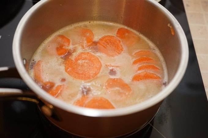 • А пока займёмся соусом. Морковь почистим, порежем на колечки и вместе с маслом и натёртым на мелкой тёрке имбирём (длиной примерно 1 см) кладём в сотейник. Заливаем водой, чтобы только покрывало морковь и варим под крышкой на среднем огне 40 минут.