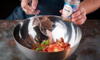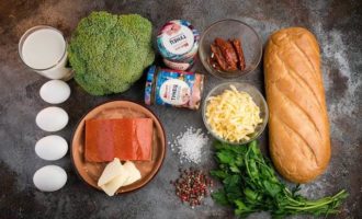 • Тем временем готовим начинку. В оставшуюся молочно-яичную смесь добавляем мелко нарезанные: брокколи, семгу, вяленые помидоры, размятый вилочкой тунец и порезанный мелким кубиком сыр. Хорошенько перемешиваем.