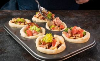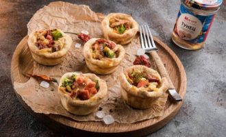 • Начинку выливаем в зарумяненные корзинки и выпекаем в духовке еще минут 10 — 15 до румяного цвета.
