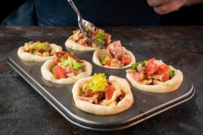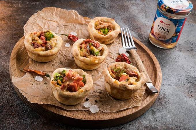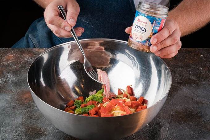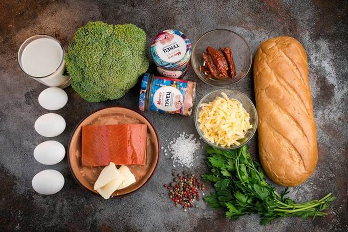 • Тем временем готовим начинку. В оставшуюся молочно-яичную смесь добавляем мелко нарезанные: брокколи, семгу, вяленые помидоры, размятый вилочкой тунец и порезанный мелким кубиком сыр. Хорошенько перемешиваем.