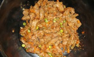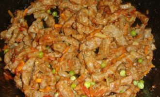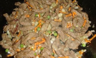 Как в сковороде испарится жидкость добавить к мясу овощи, посолить, всыпать приправу и тушить минут 15 под закрытой крышкой.
