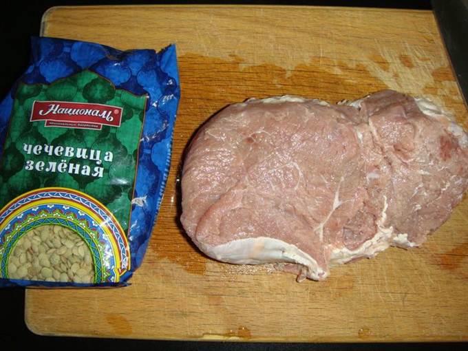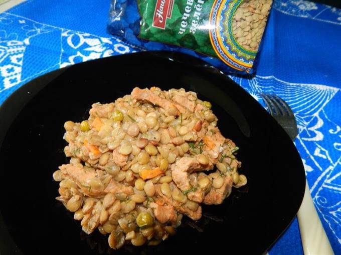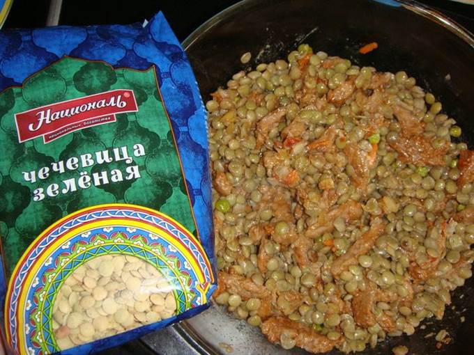 Чечевицу с тушеным мясом подавать к столу горячей с соленьями.