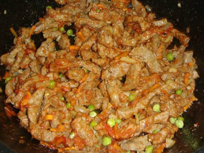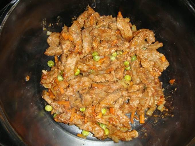 Как в сковороде испарится жидкость добавить к мясу овощи, посолить, всыпать приправу и тушить минут 15 под закрытой крышкой.