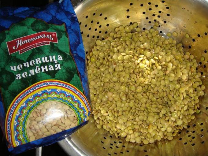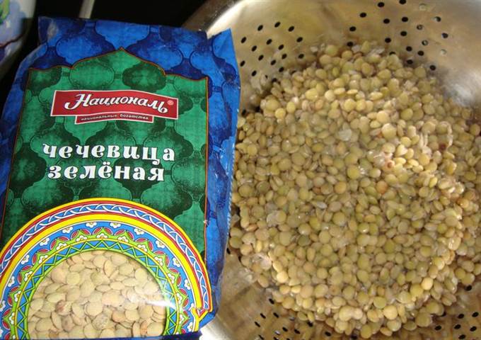 Зеленую чечевицу ТМ «Националь» перебрать, промыть и залить водой. Оставить на ночь.