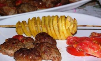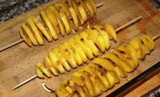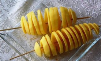 Второй вариант — нарезать картофель кольцами и нанизать на шпажку на небольшом расстоянии друг от друга. -