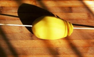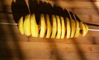 Дорезаем до конца и аккуратно растягиваем порезанную картофелину вдоль шпажки.