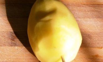 Как вы догадываетесь, самое сложное здесь подготовить «спиральки». Для этого нам понадобится целый картофель. Его необходимо очистить, вымыть и проткнуть по центру деревянной шпажкой.