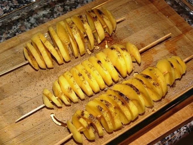 Второй вариант — нарезать картофель кольцами и нанизать на шпажку на небольшом расстоянии друг от друга. -