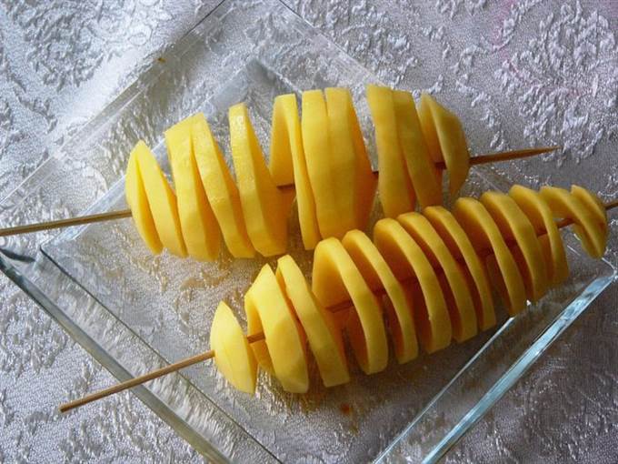 Дорезаем до конца и аккуратно растягиваем порезанную картофелину вдоль шпажки.