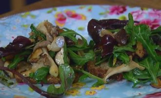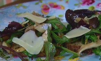 На обжаренный хлеб выложить грибы с салатом, посыпать хлопьями сыра.