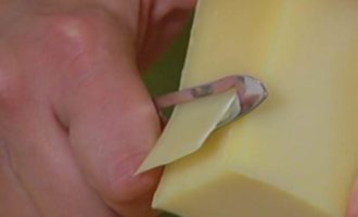 Сыр нарезать тонкими хлопьями (можно воспользоваться овощечисткой).