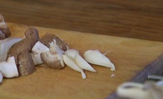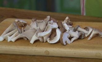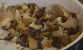 Разогреть в сковороде сливочное масло и 1 ст. ложку оливкового масла, добавить грибы, веточки тимьяна, лимонную цедру, немного посолить, поперчить, перемешать и обжарить грибы и чеснок до золотистого цвета.