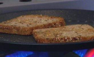 Разогреть в отдельной сковороде 1 ст. ложку оливкового масла и обжарить хлеб с двух сторон.