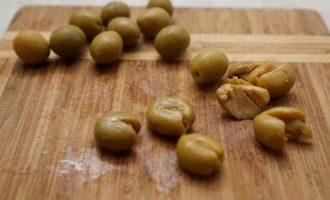 Плоской стороной ножа раздавить оливки, извлечь косточки и нарезать.