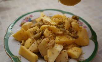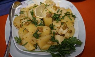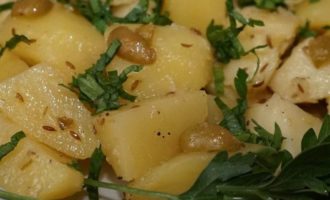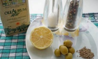Картофель почистить (молодой картофель, конечно же, чистить не надо!), крупно порезать. Переложить в миску и смешать с нарезанными оливками, посыпать зирой, цедрой с одного небольшого лимона, посолить, поперчить, сбрызнуть лимонным соком. Хорошо перемешать и выложить в глубокую разогретую сковороду.