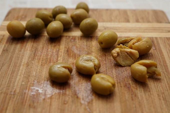 Плоской стороной ножа раздавить оливки, извлечь косточки и нарезать.