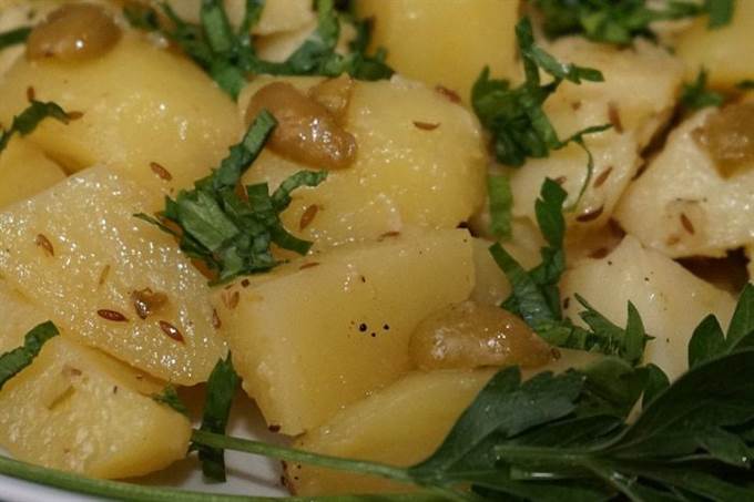 Картофель почистить (молодой картофель, конечно же, чистить не надо!), крупно порезать. Переложить в миску и смешать с нарезанными оливками, посыпать зирой, цедрой с одного небольшого лимона, посолить, поперчить, сбрызнуть лимонным соком. Хорошо перемешать и выложить в глубокую разогретую сковороду.