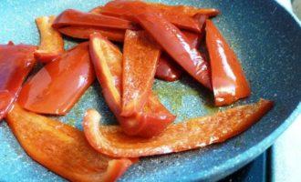 • В отдельной сковороде обжарить сладкий перец, постоянно помешивая.