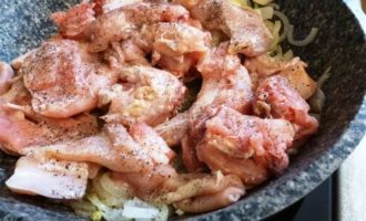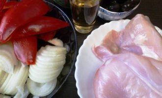 • Подготовим все продукты. Лук нарежем полукольцами, сладкий перец на 5 — 6 частей. Кролика обмыть, обсушить бумажным полотенцем и нарезать на кусочки.