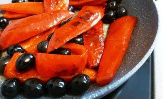 • Когда кусочки перца подрумянятся, кладем маслины и жарим еще 5 минут.