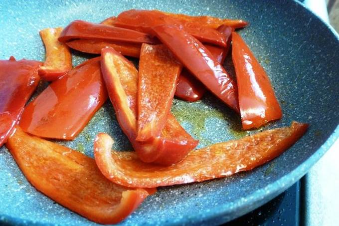 • В отдельной сковороде обжарить сладкий перец, постоянно помешивая.