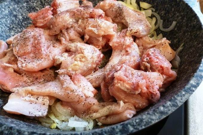 • Добавим кусочки кролика, посолим и поперчим. Обжарим, не допуская, чтобы лук пригорел, минут 5 — 7. Затем вольем сухое белое вино и тушим 30 — 40 минут.