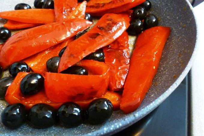 • Когда кусочки перца подрумянятся, кладем маслины и жарим еще 5 минут.