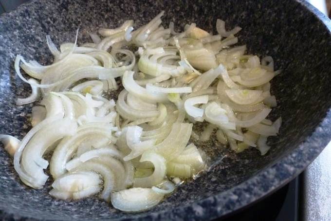 • Разогреем сковороду с маслом и припустим лук до мягкости.