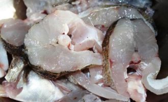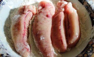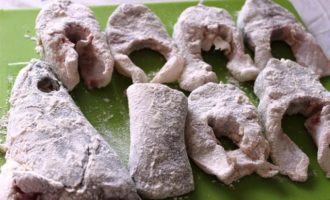 Кстати, голову рыбы мы не выбрасываем (для любителей). Необходимо удалить жабры и глаза, разрезать голову вдоль и развернуть (как бабочка)… тоже обвалять в панировке.
