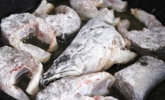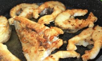 На сковороде нагреть масло и выложить кусочки рыбы… обжаривать на сильном огне (не закрывать крышкой, чтобы образовалась хрустящая корочка).