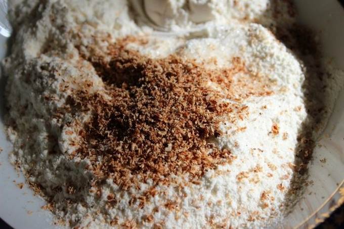 Подготовить панировку: смешать муку, соль, перец и мускатный орех, который обязательно должен быть свежим (его надо натереть на мелкой терке).