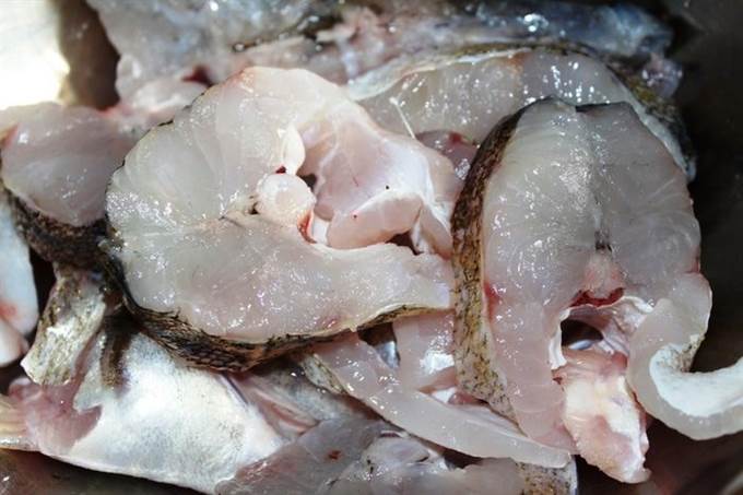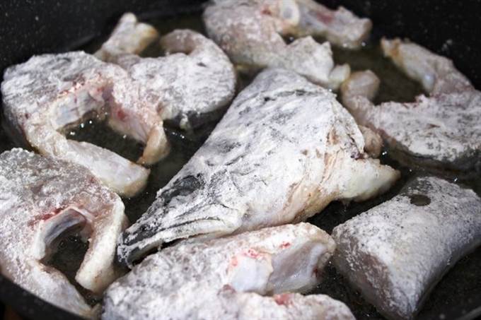 На сковороде нагреть масло и выложить кусочки рыбы… обжаривать на сильном огне (не закрывать крышкой, чтобы образовалась хрустящая корочка).