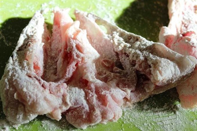 Кстати, голову рыбы мы не выбрасываем (для любителей). Необходимо удалить жабры и глаза, разрезать голову вдоль и развернуть (как бабочка)… тоже обвалять в панировке.