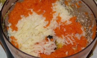Картофель очистить, натереть на терке, добавить к яйцам. Тыкву натереть, добавить в массу, перемешать.