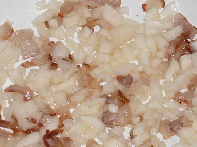 Лук измельчить и добавить к салу, помешивая, жарить до прозрачности лука. Немного остудить.