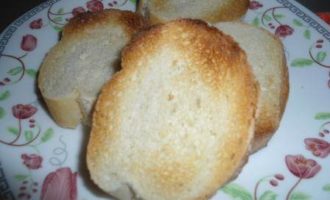 Багет порезать на кусочки и поджарить в тостере. Сбрызнуть оливковым маслом.