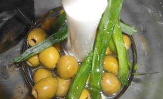 • Теперь нам понадобится измельчитель. В чашу выкладываем оливки, капусту, лук и зелень, чеснок и лимонный сок.Наливаем масло и измельчаем.