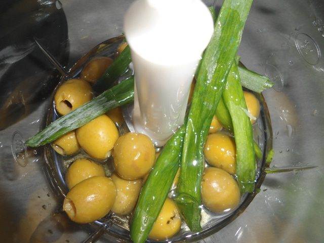 • Теперь нам понадобится измельчитель. В чашу выкладываем оливки, капусту, лук и зелень, чеснок и лимонный сок.Наливаем масло и измельчаем.