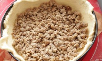 • Делим тесто на части, нижний слой должен быть потолще, выкладываем фарш