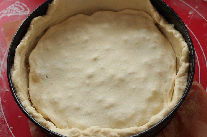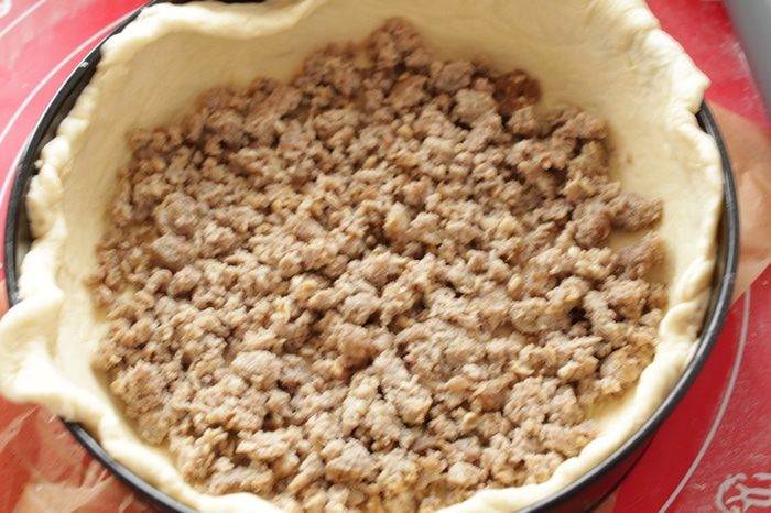 • Делим тесто на части, нижний слой должен быть потолще, выкладываем фарш