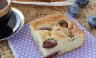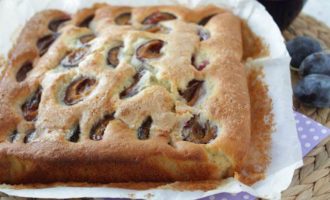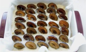 Выложить в форму, выложенную пекарский бумагой. Порезать сливы на половинки, выложить на тесто, посыпать оставшимся сахаром (лучше коричневым).