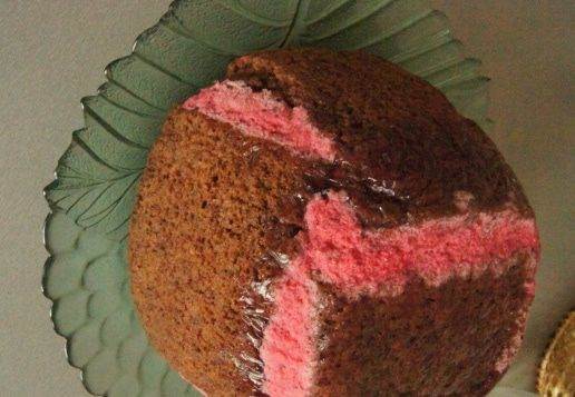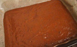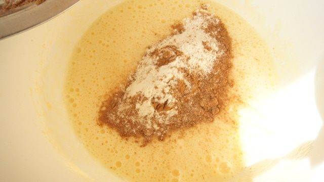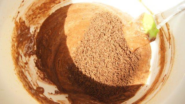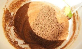 Муку, разрыхлитель и какао просеять. Добавить в тесто и перемешать лопаткой.